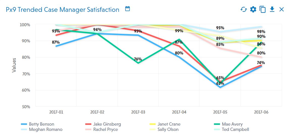 Want to see how overall patient satisfaction is trending? Want to cut it by case manager? How did OSAT change after you launched your new disease state education program? The screenshot below should give you a sense of how tying employee data—specifically the assigned case manager—to patient feedback can enrich your analysis. Tying operational and employee data to patient survey response data allows you to get to those types of insights and much more: